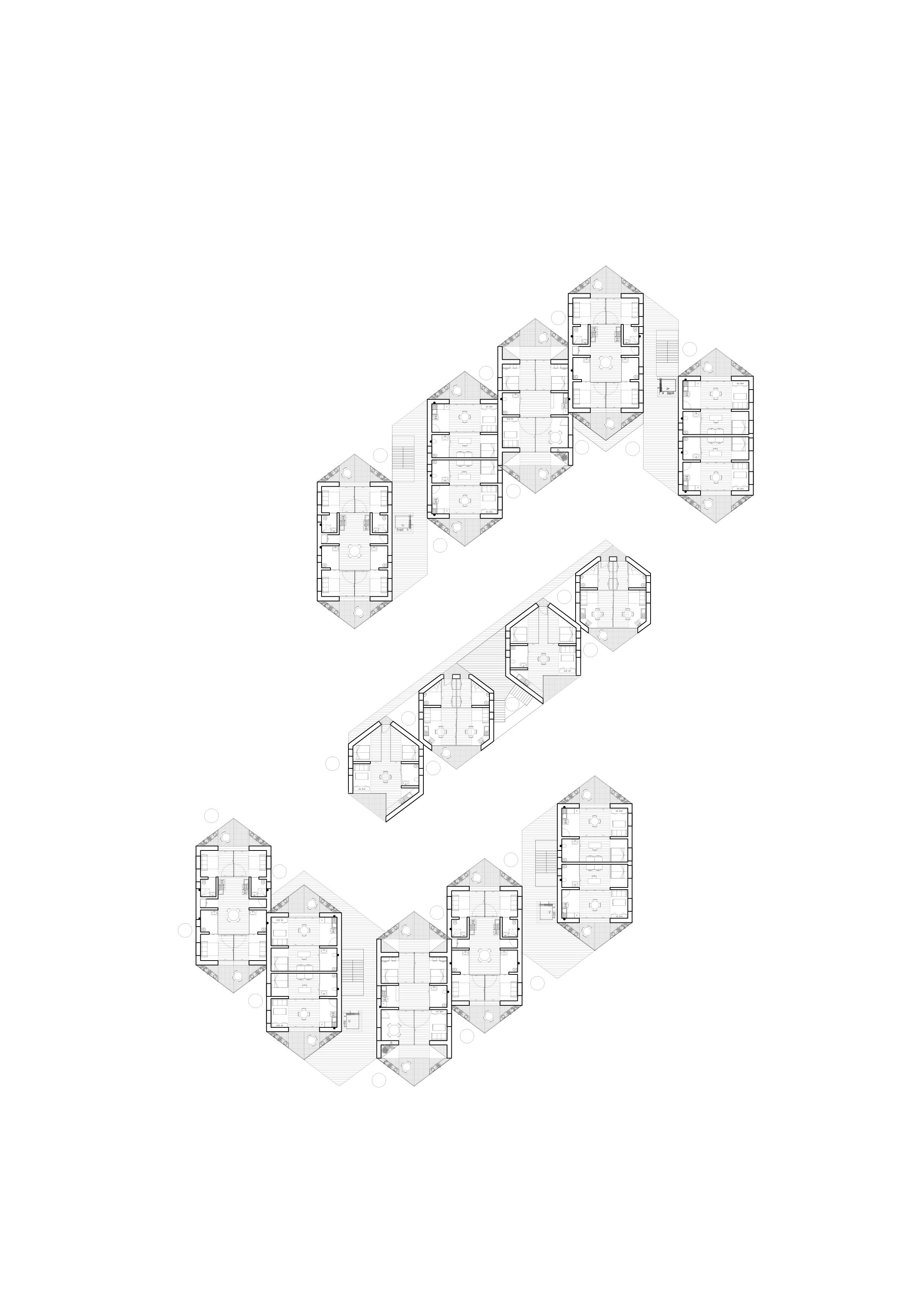 Le rez-de-jardin accueille deux chambres, tandis que le rez-de-chaussée comprend une terrasse en bois orientée au sud. Cette terrasse est couverte par une toiture soutenue par un mur au nord, qui donne l'illusion d'une pièce fermée vue depuis la rue. Cet espace fonctionne comme un salon d’été, ouvert sur l’extérieur et le paysage.